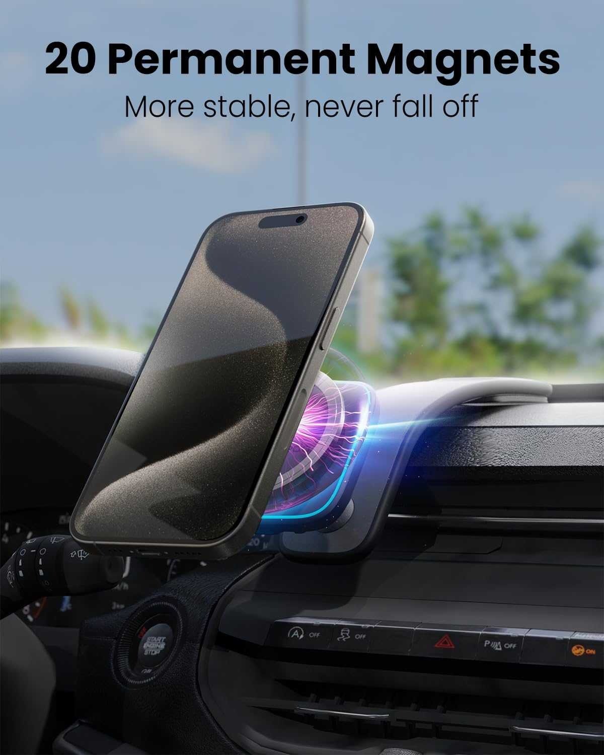 20x Strong Magnetic Power: Equipped with extremely strong magnets, this holder securely holds large phones without affecting the phone signal, ensuring hands-free and safe driving.