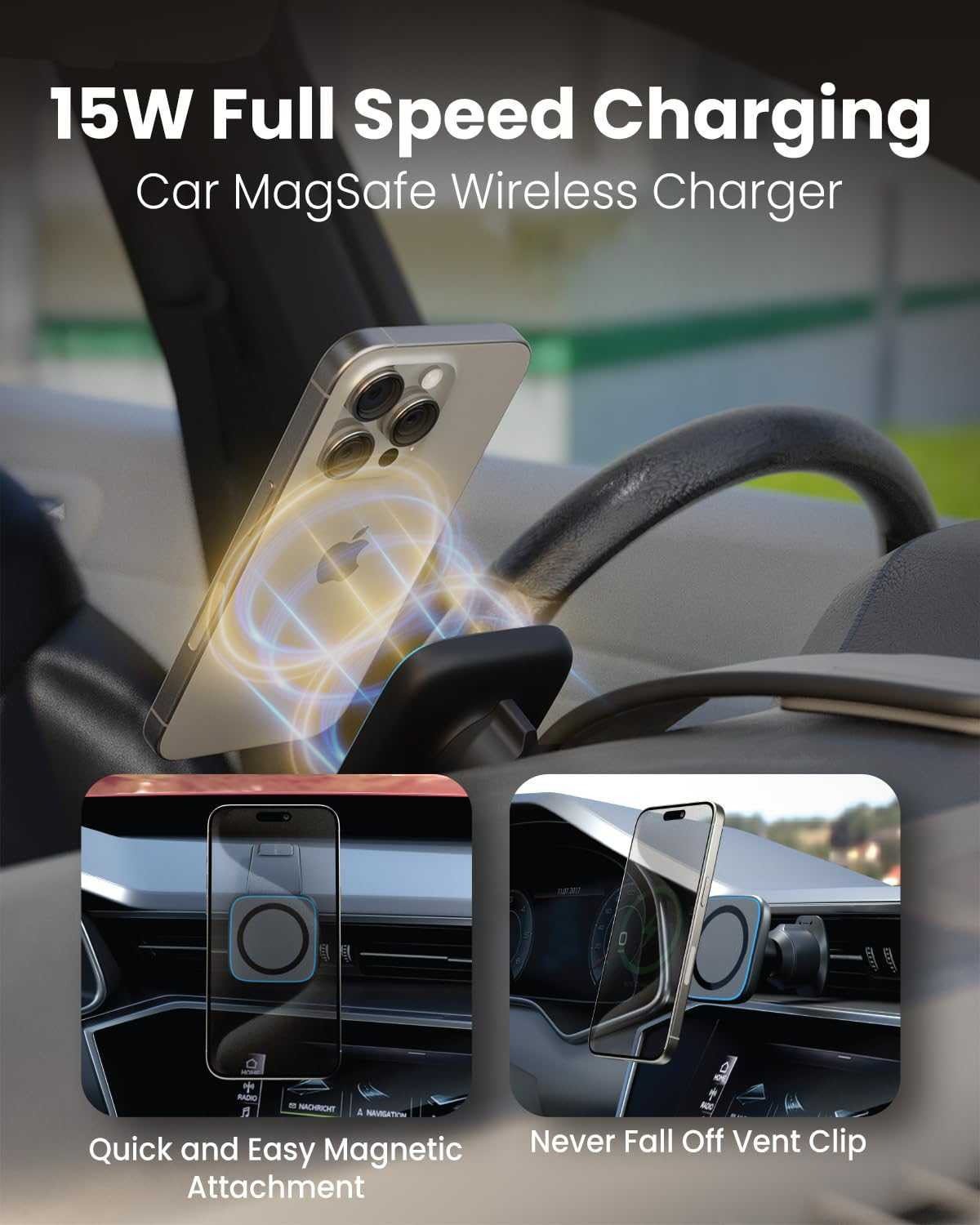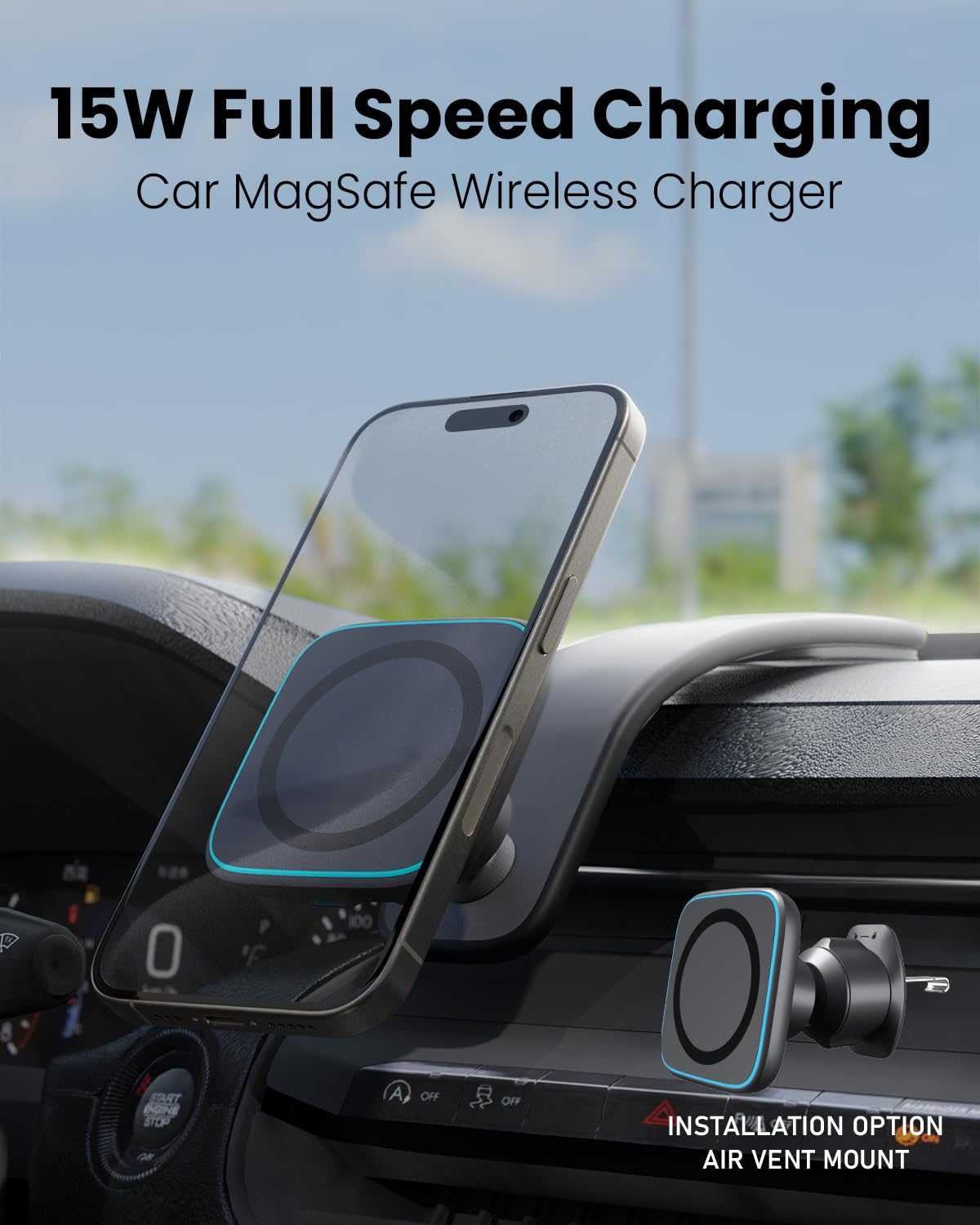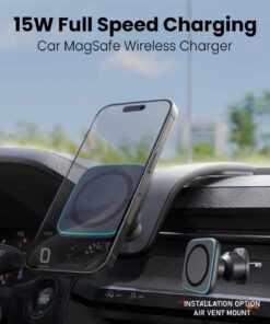 15W Wireless Charging: Combines 15W full-speed wireless charging with a phone holder mount. This car wireless charger offers fast charging, saving you from messy cables and cases while driving.
